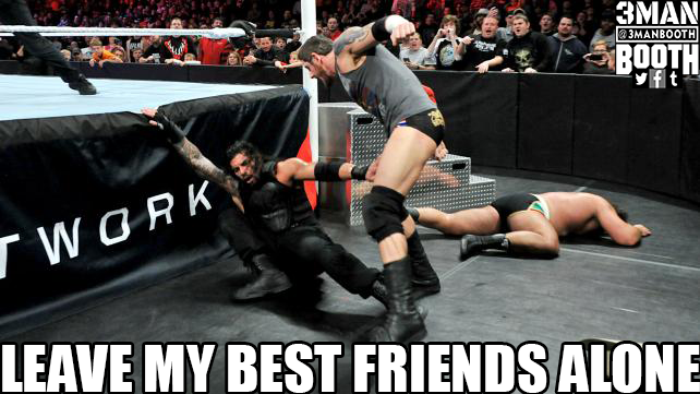 Roman Reigns eventually gets the upperhand when he finds a steel chair and beats down Barrett, Rusev and #ScumbagSheamus.