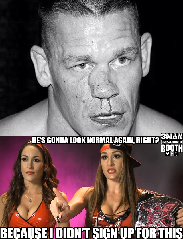 In the ring, Cena takes on Seth Rollins in the US Open Challenge. During the match, Rollins hits Cena with a knee strike that breaks Cena’s nose! Nikki, backstage, is freaking out. Cena’s nose is on the side of his face but he keeps wrestling! Cena wins the match, even telling the doctors in the ring, “I’m okay.” Nikki, though, is not.