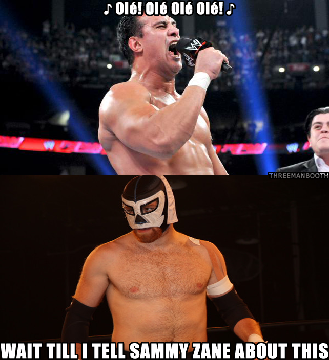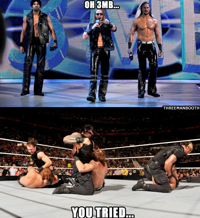Heath Slater tells The Shield to Shut Up and says they have some unfinished business with 3MB (Not us) tonight. Drew McIntyre asks who The Shield think they are then claims they were seconds away from showing Triple H exactly how they rock and roll until The Shield crashed their party. Jinder Mahal chimes in by saying 3MB is going to crash The Shield’s party and “rock their face.”