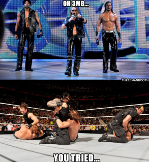 Team Hell No come down to the ring and clear the ring. Then attack 3MB.