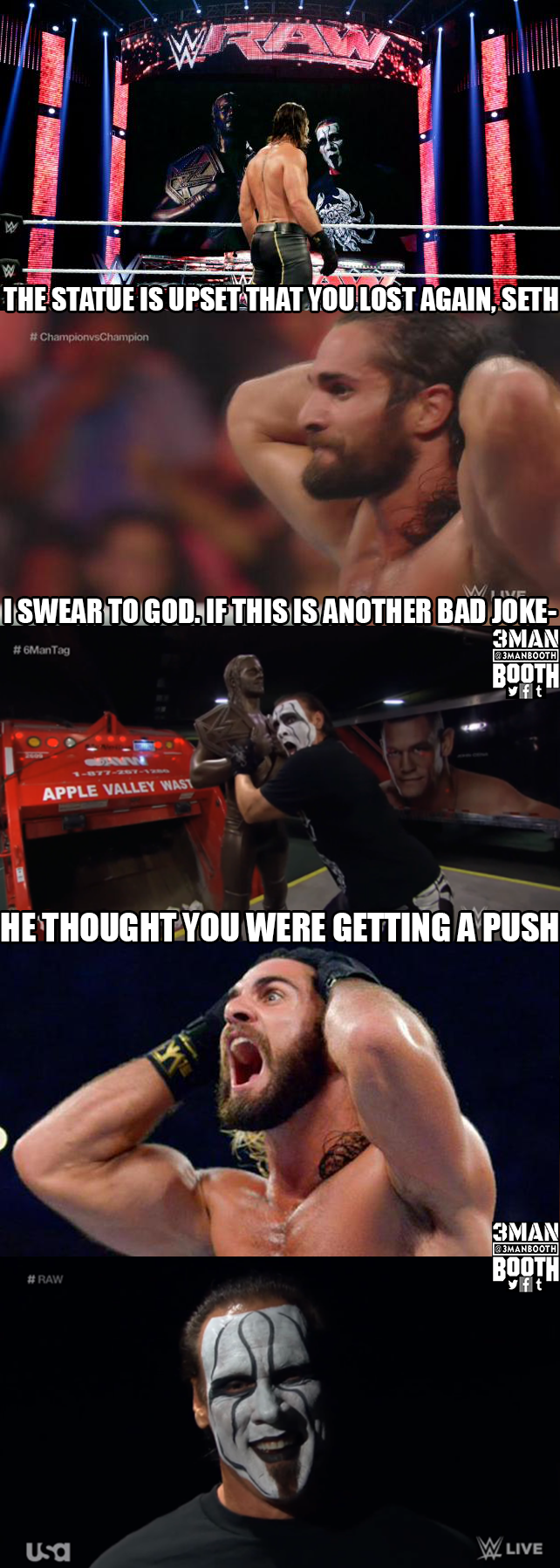 Seth Rollins comes out next, claiming he had no problems with Sting until Sting stole his statue. Rollins calls himself a real man and calls Sting out. Rollins demands that Sting take back that Triple H is better than him, because Rollins is just as good and maybe one day even better. Rollins also demands that Sting tell him where the statue is.