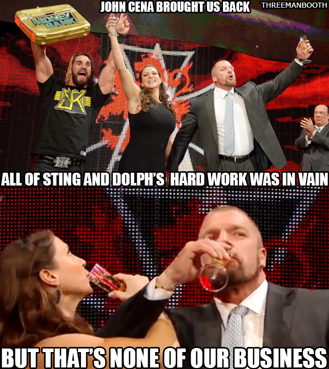 The main event saw John Cena take on Seth Rollins and Kane in a Street Fight. Rollins tried to give Cena the gift of an early exit but Cena, naturally refused. Never tell Cena the odds, Seth! He’ll overcome them. Several times in this match, Kane and Rollins tried to hit Cena with everything.