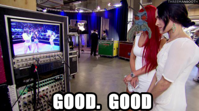 Eva Marie and Brie Bella ask JoJo and The Funkadactyls how they think the performance went. They knew it was messed up but Cam’ron is happy how it came out anyway.