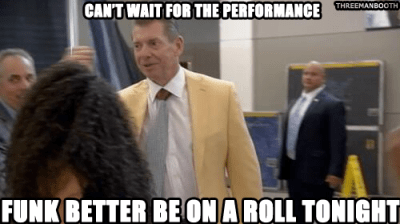 Mr. McMahon walks up and tells them that he’s looking forward to their performance tonight.