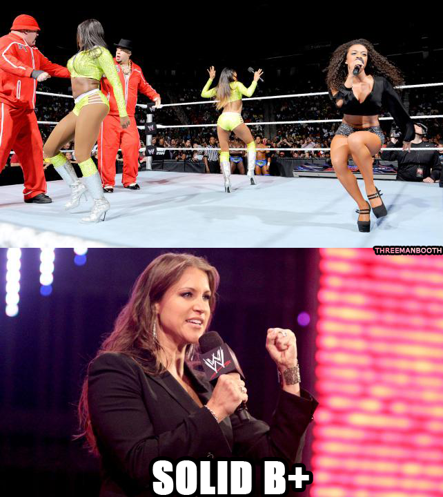 Cam’ron, Naomi and JoJo perform Somebody Call My Mama as Eva Marie, Brie Bella and Jane watch. It’s not very good.